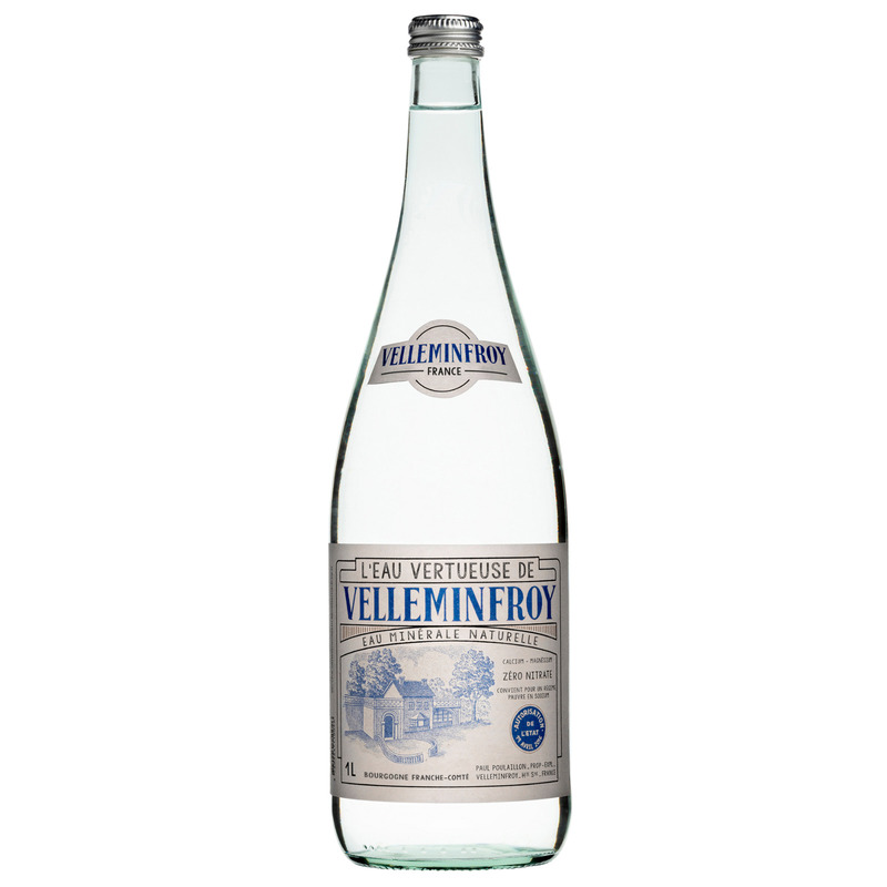 Cette eau de source exceptionnelle nous vient de Franche-Comté où elle a été découverte en 1828, d'abord vendue en pharmacie. 6 fois millénaire, elle est extrêmement pure et exempte de tous nitrates. Elle est toutefois riche en minéraux et pauvre en sodium. La composition minérale de Velleminfroy lui confère un goût subtil qui s'accorde parfaitement avec le sucré ou le salé.